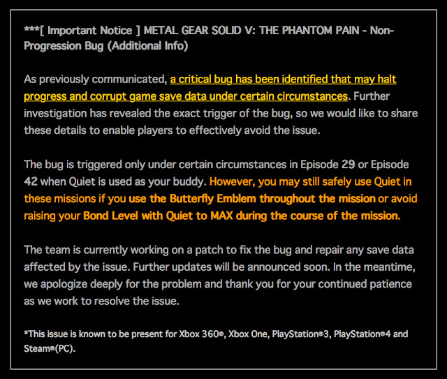 Un problema se ha informado, donde se mantendrá el juego en un bucle continuo en una pantalla de negro; el equipo está investigando la causa y resolución. Hasta informado; por favor, evitar jugar misiones 29 y 42 durante el uso de Quiet como su amigo, ya que esto parece estar ligada a la causa del problema.